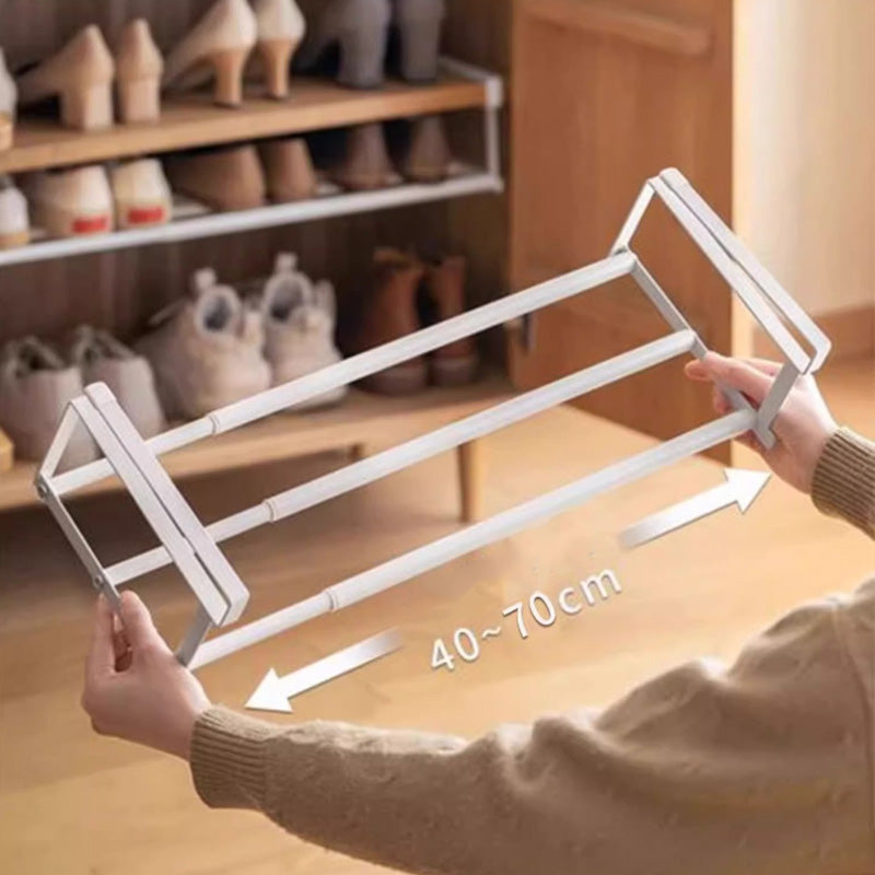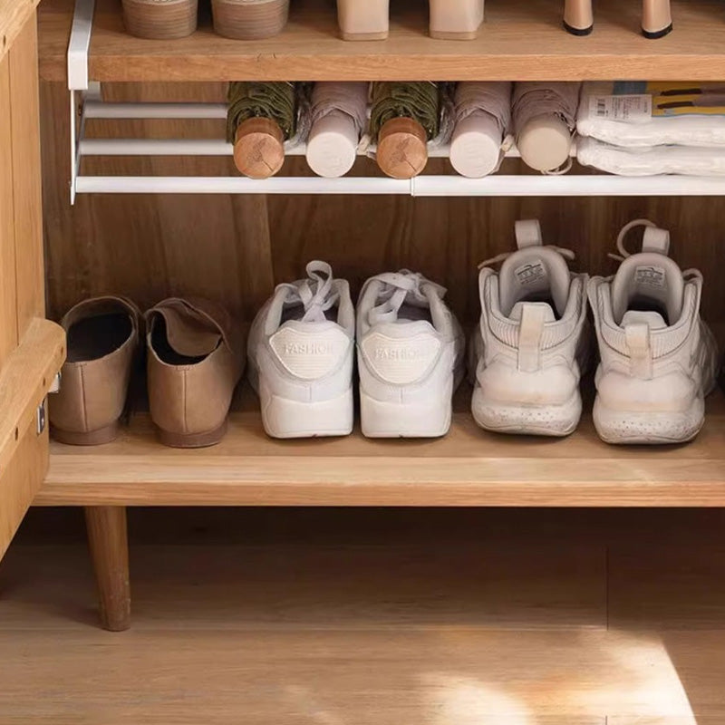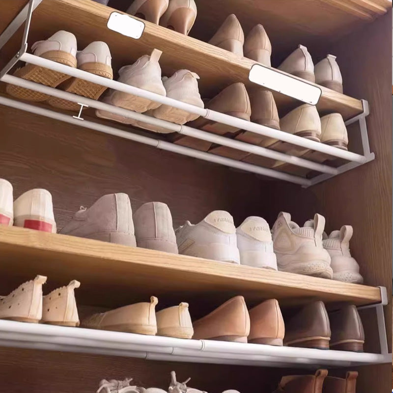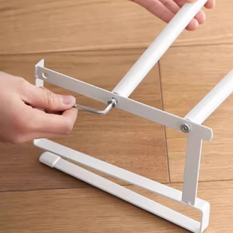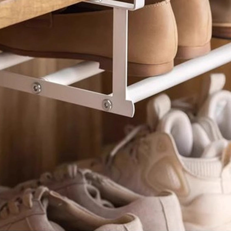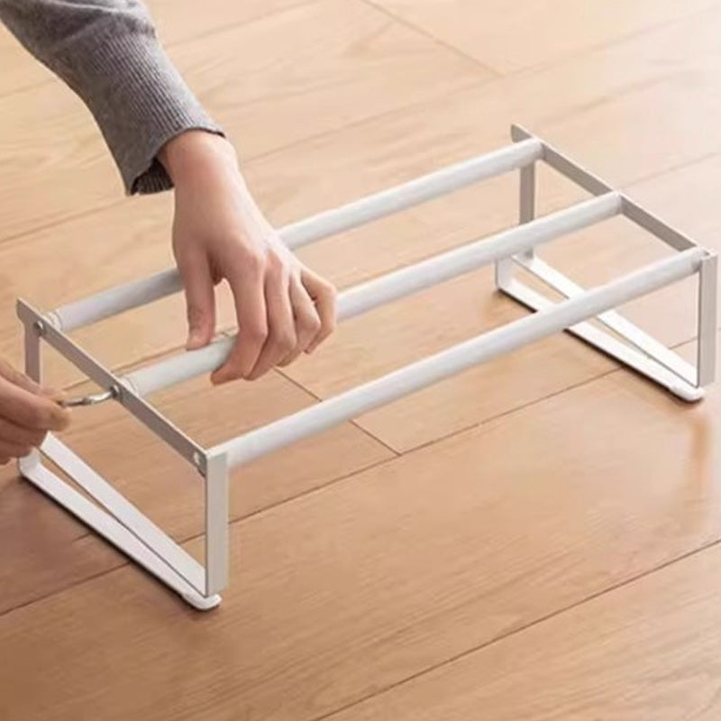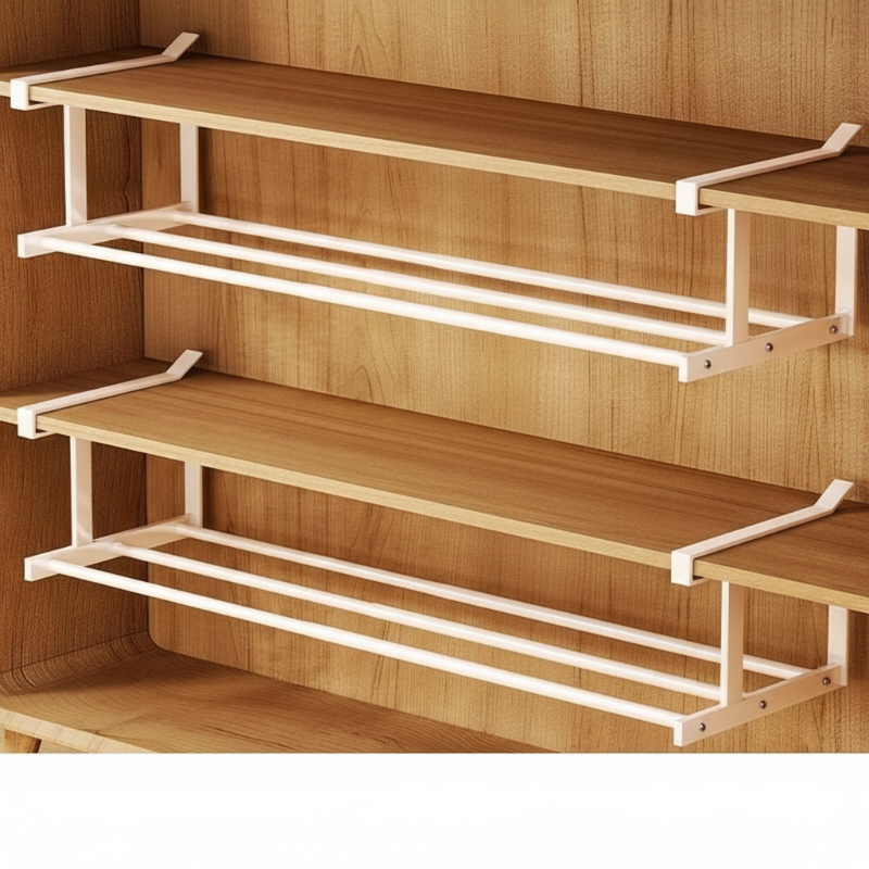 INSTALACE BEZ VRTAČKY – Okamžitě zvětšete úložný prostor bez poškození nábytku. Tento chytrý regál se jednoduše nasune na stávající police a nevyžaduje žádné nářadí ani hardware. Bezpečné a stabilní uchycení je hotové během několika sekund.
