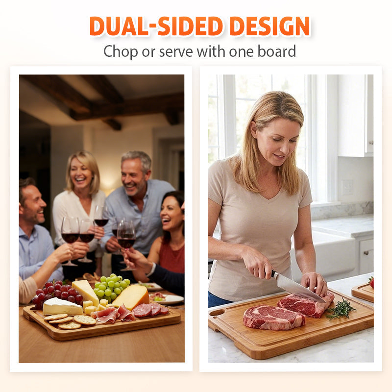 OBOUSTRANNÁ FUNKČNOST – Použijte drážkovanou stranu pro všechny vaše potřeby krájení a jednoduše ji otočte, abyste mohli použít hladkou stranu. Plochý zadní povrch je ideální pro podávání sýrů, krekrů, chleba a uzenin.