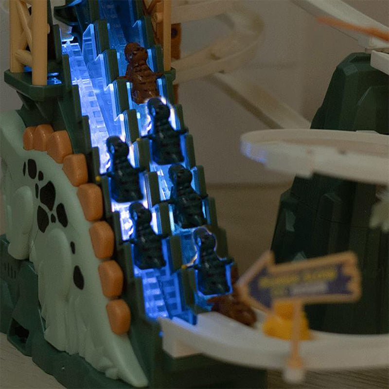 ZMĚNITELNÁ DRÁHA A SVĚTELNÝ DUÁLNÍ REŽIM VÝSTUPU PO SCHODECH: Přepnutím páčky na dráze můžete snadno změnit trasu dinosauřího autíčka. Výstup po schodech má po zapnutí světelný efekt LED.