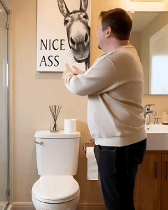 Přestaňte brát život tak vážně, dokonce i v koupelně. Tento vtipný potisk s oslem okamžitě prolomí ledy a zaručí úsměv nebo hlasitý smích každého, kdo ho uvidí.