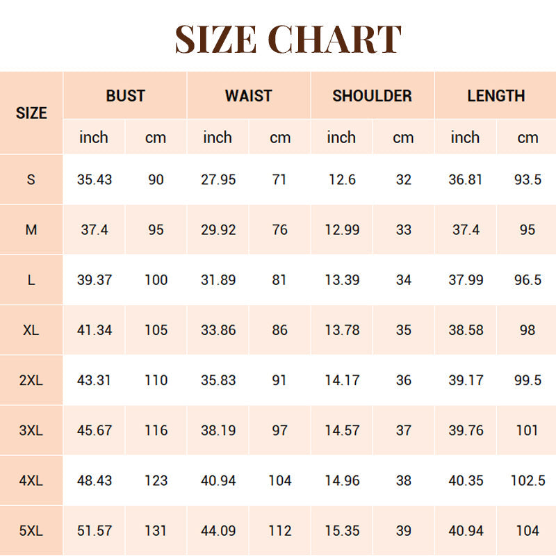 Nabízíme různé velikosti (od S až po 5XL!) a vždy si můžete vybrat tu správnou velikost pro vás.💖 Střih těchto šatů dokáže upravit různé postavy a skrýt tuk.🤫