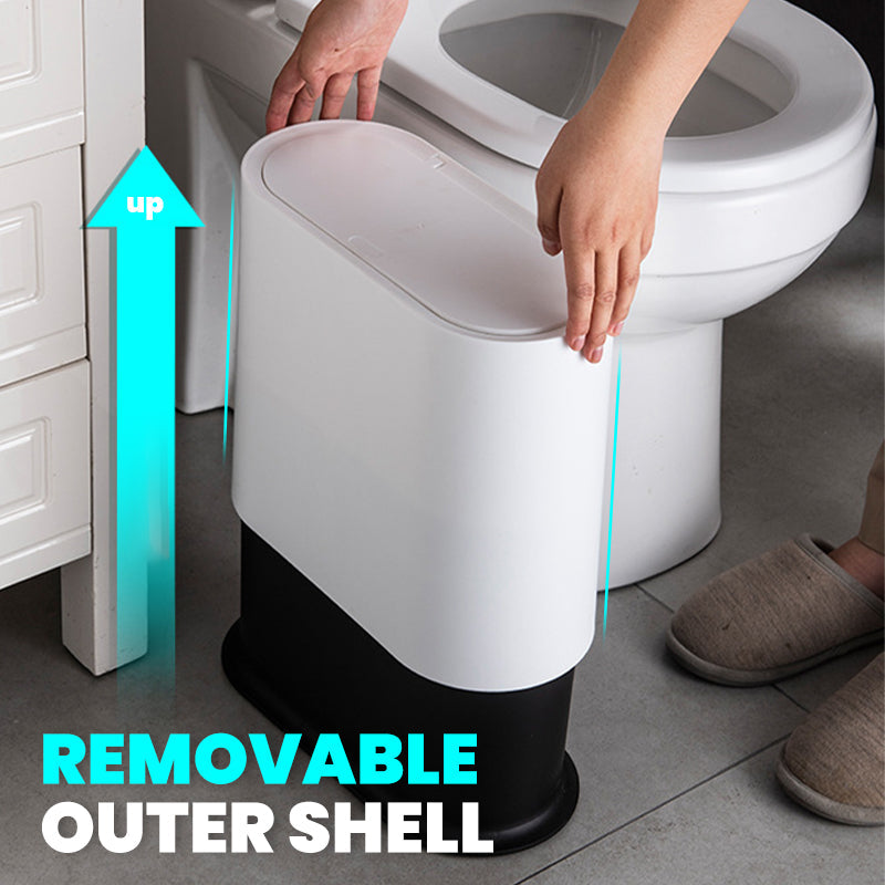 ÚSPORNÝ DESIGN – Tento štíhlý odpadkový koš, pečlivě vyrobený speciálně pro úzké prostory, je důmyslně navržen tak, aby se pohodlně vešel do těsných rohů, čímž efektivně maximalizuje dostupnou podlahovou plochu.