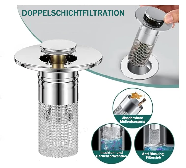 Na rozdíl od běžných tlačítkových odtoků má tento odtokový uzávěr uprostřed koš, který je navržen tak, aby zabraňoval znečištění a čistě sbíral prameny vlasů, čímž zabraňuje jejich vniknutí do odtoku. Šperky, prsteny, nečistoty a další předměty se nedostanou do odtokových trubek.