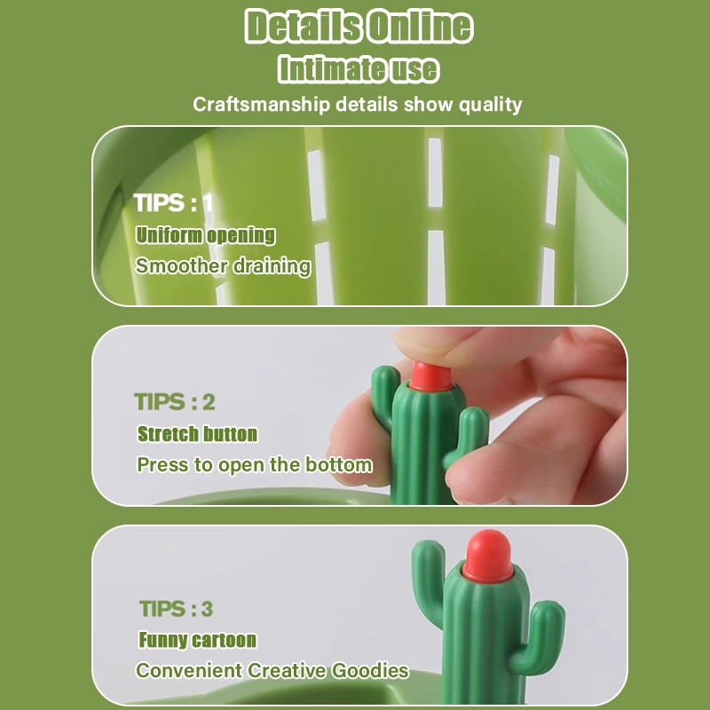 Chápadla kaktusu slouží jako pohodlná rukojeť, která usnadňuje vyjmutí a filtrování odpadu, aniž byste si zašpinili ruce. Více odtokových otvorů a otočný design pro rychlé odvodnění. Vyrobeno z materiálu bezpečného pro myčky nádobí.