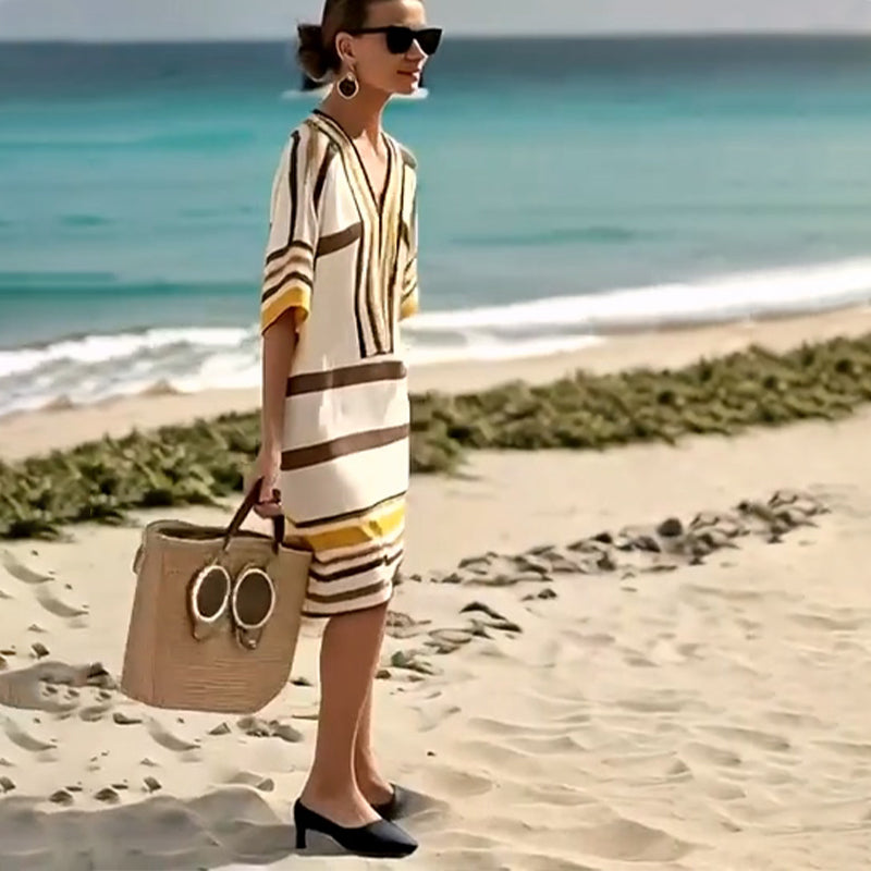 PLÁŽOVÝ LOOK PRO KAŽDOU PŘÍLEŽITOST - Tyto šaty se plynule hodí k pobytům u moře i víkendovým brunchům. Doplňte je doplňky nebo si je jednoduše obujte se sandály - výsledek je vždy elegantní a vždy připravený na léto.