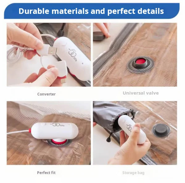 USB vakuová pumpa – Zažijte snadnou kompresií, ať jste kdekoli, s naší USB vakuovou pumpou. Připojte ji k mobilnímu napájecímu zdroji nebo notebooku a komprimujte na cestách.
