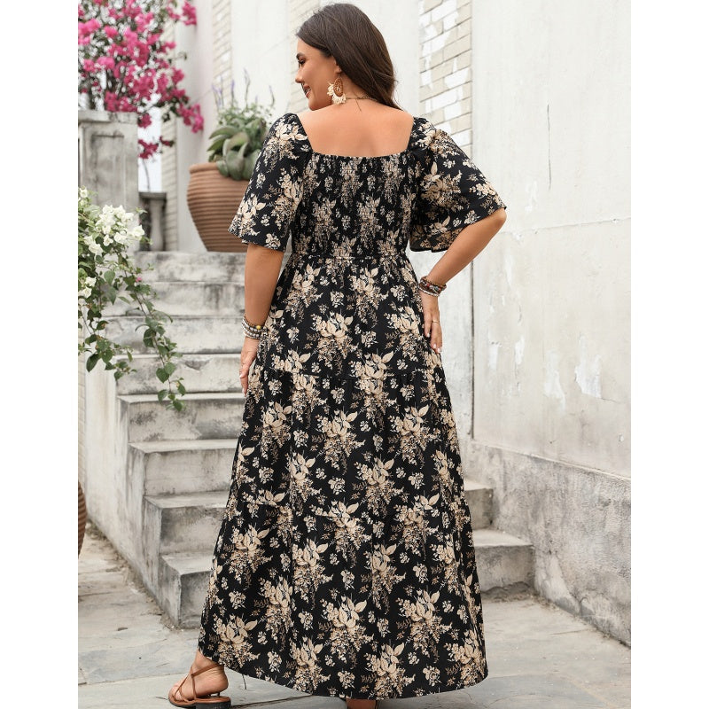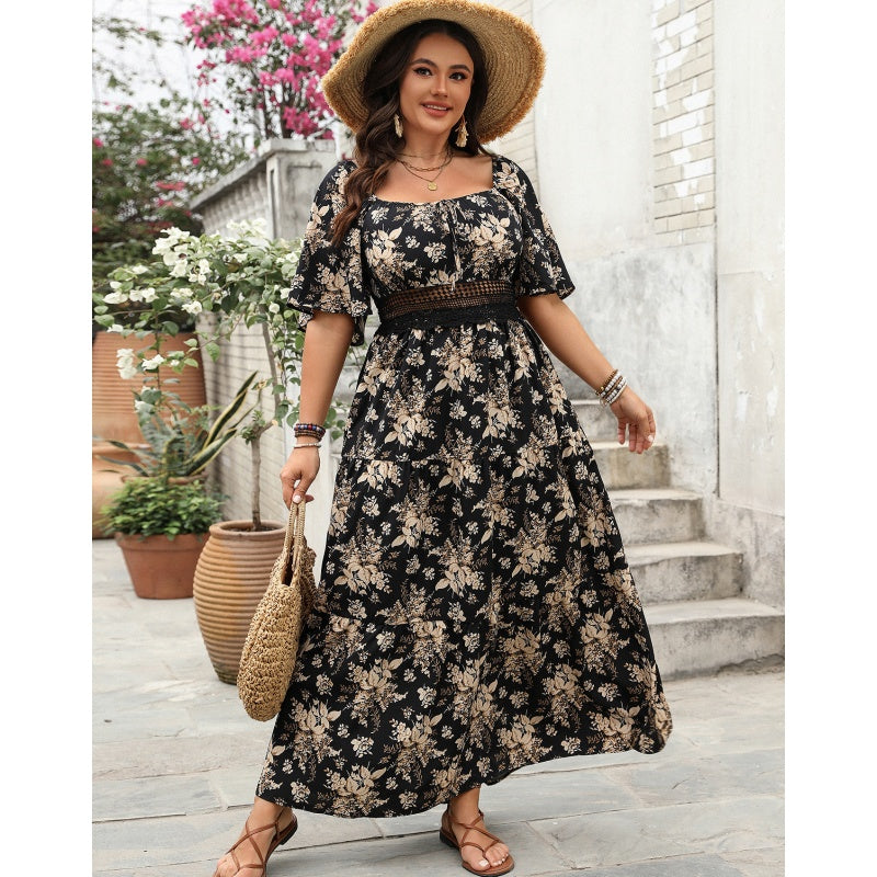 Vintage Gold Floral Print Breathable Flowy Dress with Waisted A-line Hem