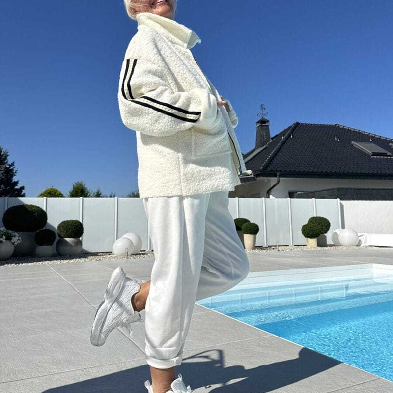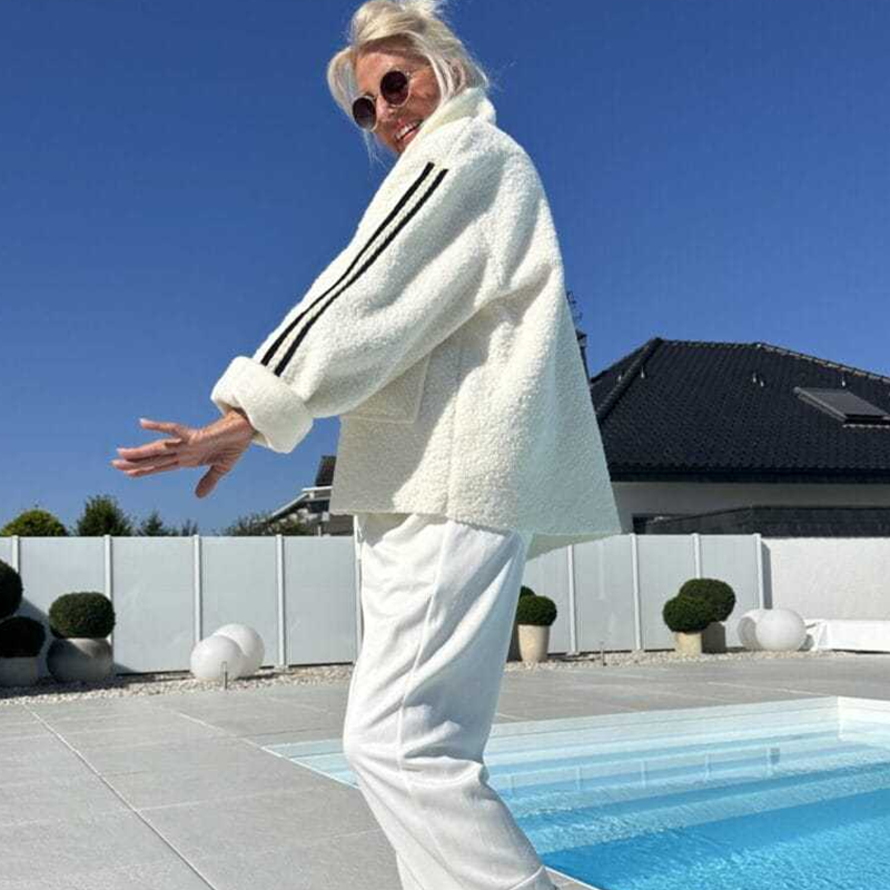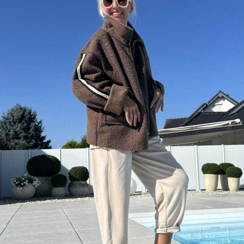SOUČASNÝ DESIGN SE SPORTOVNÍMI AKCENTY – Sofistikovaný stojáček a elegantní silueta jsou zdůrazněny výraznými pruhovanými detaily na rukávech, které dodávají moderní sportovní nádech. Tato dokonalá kombinace klasické elegance a sportovních prvků vytváří univerzální kousek, který se snadno promění z ležérního denního oblečení na sofistikovaný večerní model.