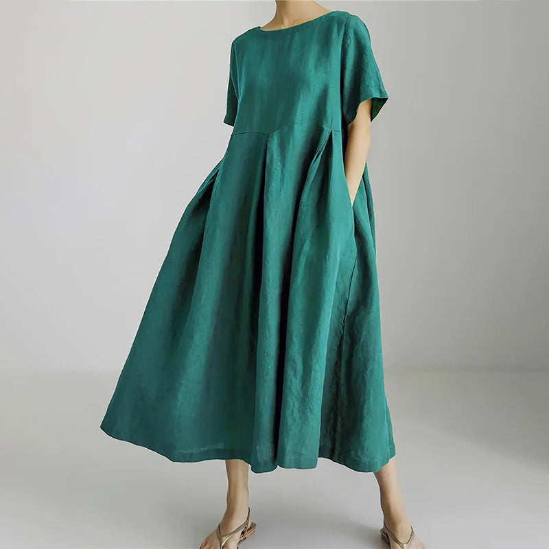 Součástí balení je: Dámské volné šaty s kulatým výstřihem a kapsami.