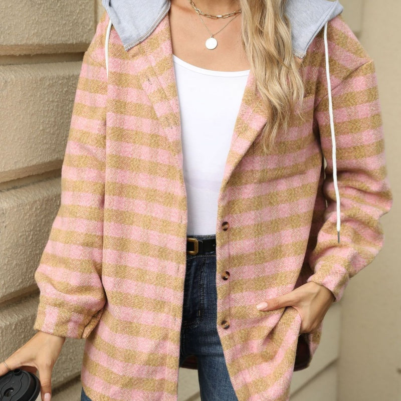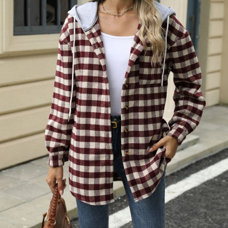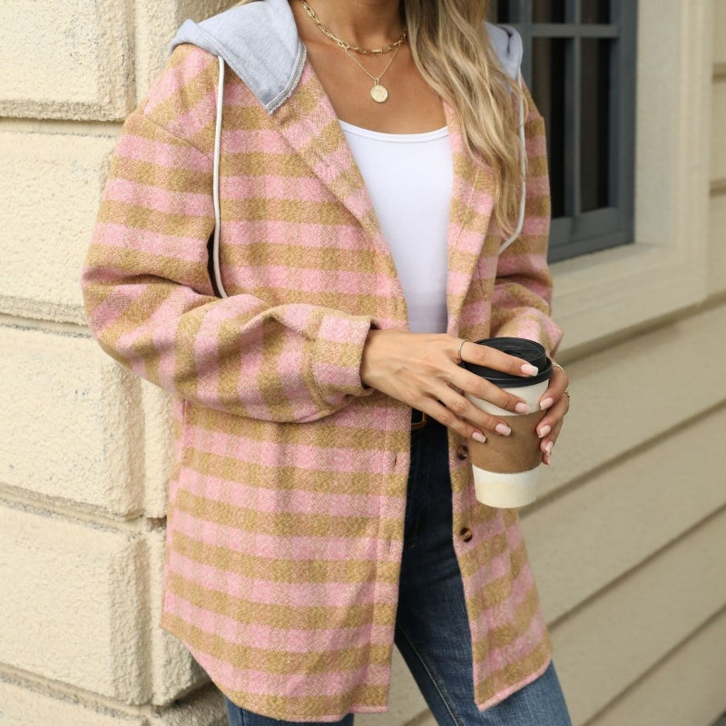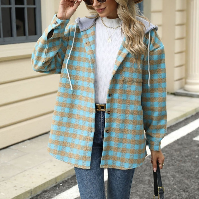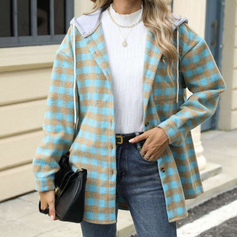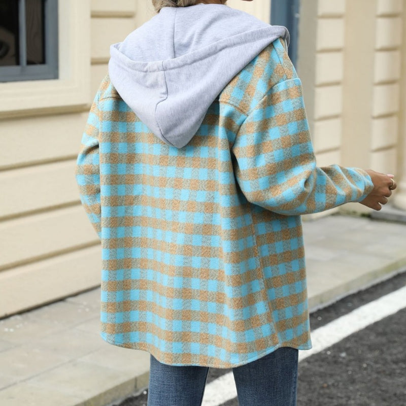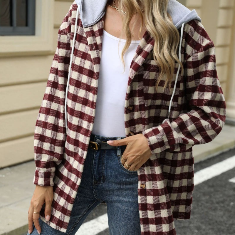 Balení obsahuje: 1*dámský kabát s kapucí a kostkovaným vzorem, jednořadý