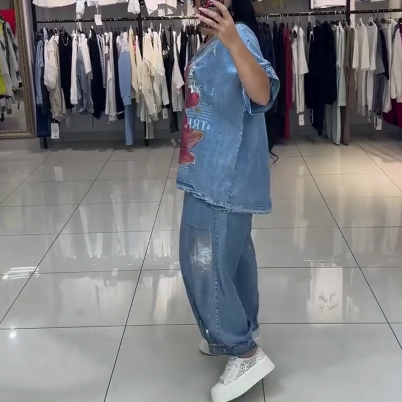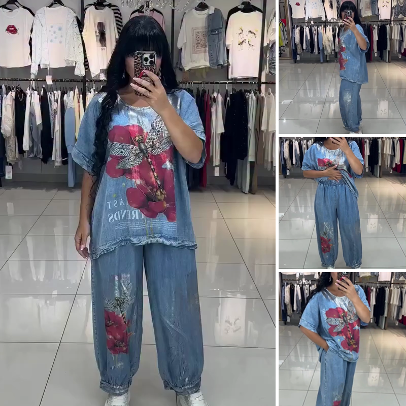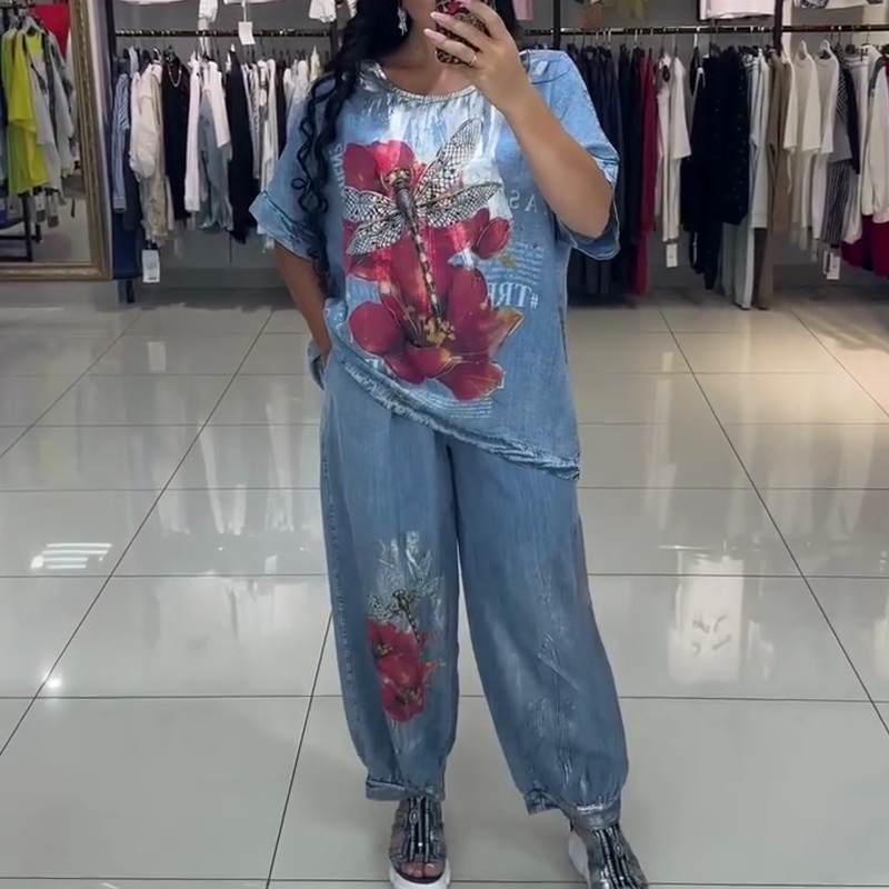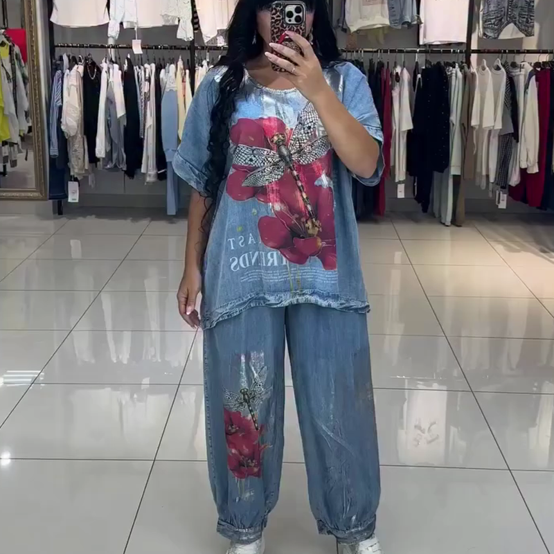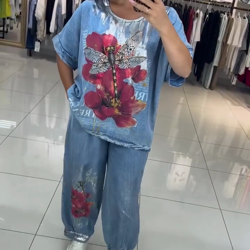 ŽIVÝ POTISKOVANÝ DESIGN - Sada se vyznačuje poutavými potisky červených květů a vážek. Tyto zářivé vzory na modrém tričku s krátkým rukávem a volných džínách vytvářejí hravý a stylový vzhled a dodávají vašemu outfitu jedinečný nádech.