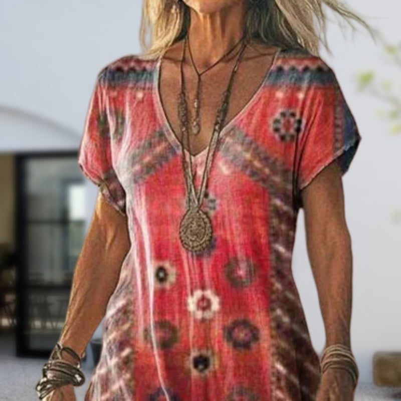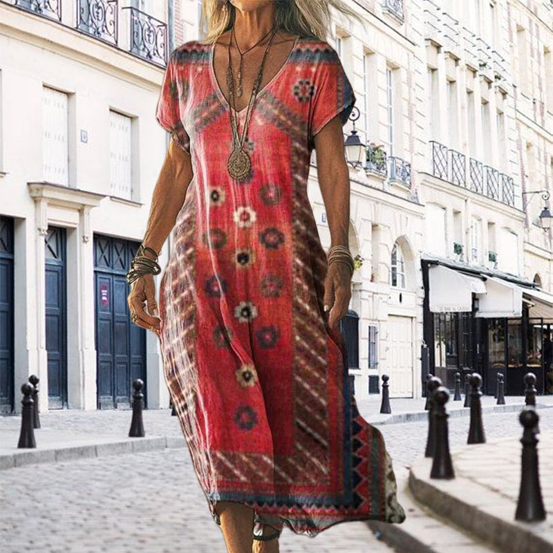 Balení obsahuje: 1 * Dámské dlouhé šaty s potiskem a krátkým rukávem do V